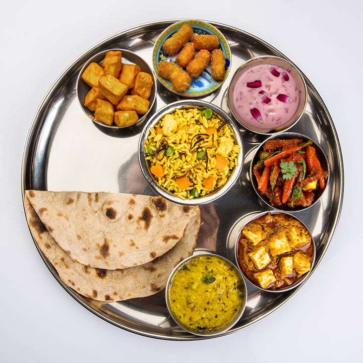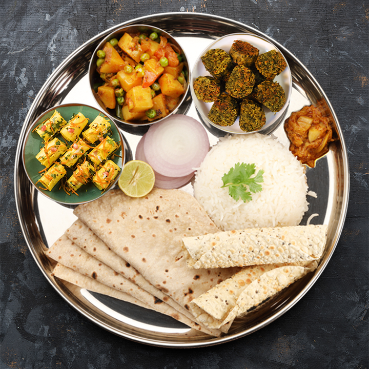 2 Types of Farsan,2 Types of Veg Main Course,2 Types of Rice, Dal, 2 Types of Indian Breads, Desserts, Additional: Salt / Lemon / Pickle