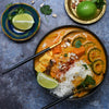 Embark on a Thai-inspired culinary adventure with a tantalizing Thai Laksa Soup and zesty Thai Paneer Chilly. Indulge in the rich flavors of Thai Red Curry served with fragrant Basil Steamed Rice, followed by the exotic pairing of Burmese Curry and Burnt Garlic Noodles. Conclude your meal on a sweet note with a decadent Brownie accompanied by a scoop of luscious Vanilla Ice Cream. Enhance your dining experience with perfectly matched accompaniments and stay refreshed with a 250ml Water Bottle.